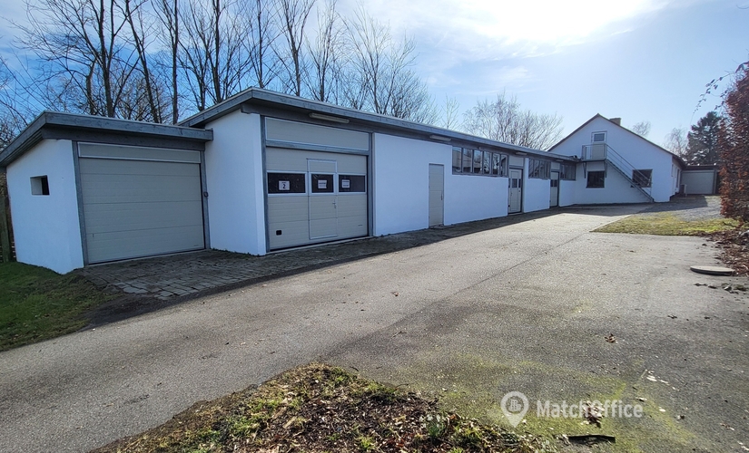 Erhvervsdelen en rektangulær bygning med et bebygget areal på 390 m2 og et samleterhvervsareal på 546 m2.Ejendommen har flere vognporte ved siden af hinanden op langs den første del af bygningen, der gør det muligt, atopdele den i mindre enheder,der eventuelt kan lejes ud. Dertil kommer et større lager-/produktionslokale samt en tagetage på 156 m2.