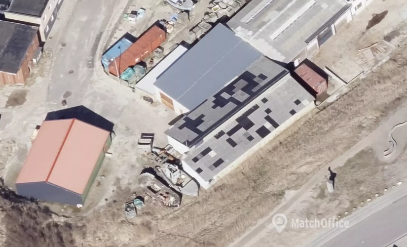 2 bygninger med 2 store portåbninger. Højloftet lagerplads med stor løbekran. 2 værkstedsrum, kontor, toilet m.m.