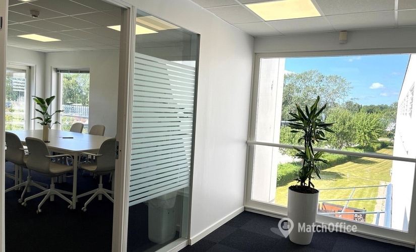 Ved ankomst til lejemålet gennem glasdøren, træder man i en hyggelig entré med garderobe, loungeområde og et åbent tekøkken, hvor gæsterne kan bydes på en kop kaffe. Videre igennem entréen træder man i lejemålets storrumskontor med masser af naturligt lys fra den lange vinduesside.