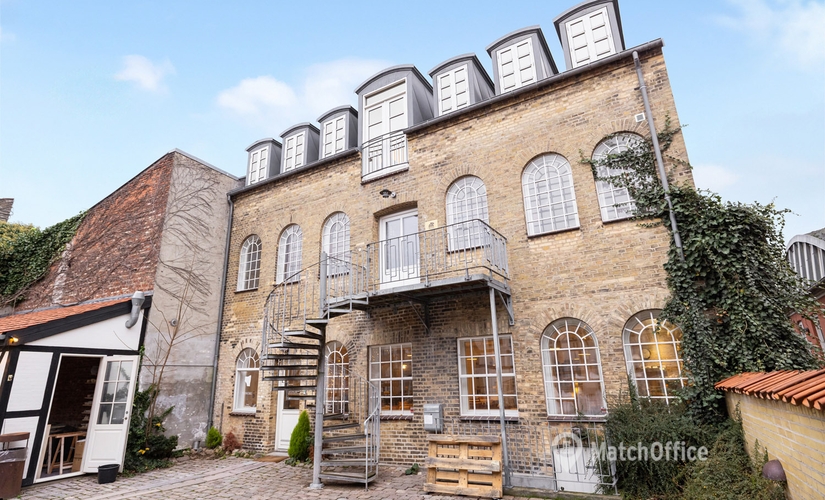 Lejemålet ligger i et stemningsfuldt gårdmiljø, hvor fritlagte bjælker og skråvægge skaber en unik atmosfære. Her er plads til at arbejde i ro, mens byens puls er lige udenfor.